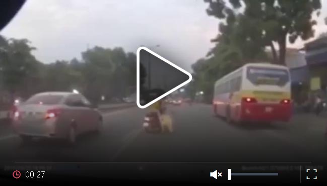 Vụ va chạm nhỏ đã khiến chiếc xe máy rơi vào tình trạng loạng choạng, mất kiểm soát, 1 đứa trẻ ngồi ở yên sau đã không thể bám chặt vào người me nên bị ngã lăn quay xuống đường.