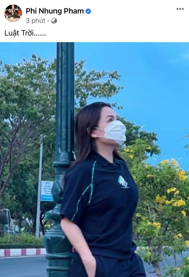 Mới đây, Phi Nhung tiếp tục gây chú ý khi chia sẻ bức hình của bản thân đeo khẩu trang kín mít. Lưng đứng tựa vào một chiếc cột. Tuy nhiên, điều khiến cư dân mạng chú ý chính là hai chữ Phi Nhung chia sẻ: "Luật trời".