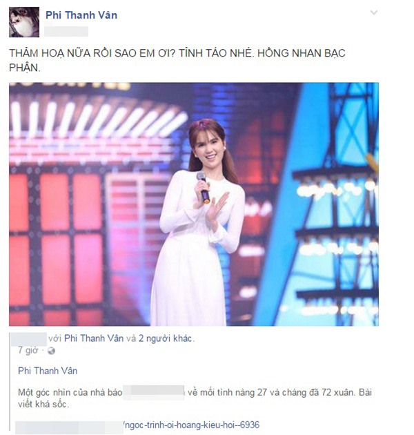 Phi Thanh Vân cho biết cảm thấy thương Ngọc Trinh khi hay tin đàn em hẹn hò với tỷ phú 72 tuổi Hoàng Kiều. Ngoài ra, cô cũng khuyên nhủ Ngọc Trinh phải thật "tỉnh táo" trong tình yêu để tránh rơi vào kiếp "hồng nhan bạc phận" cũng như cuộc tình "thảm họa".