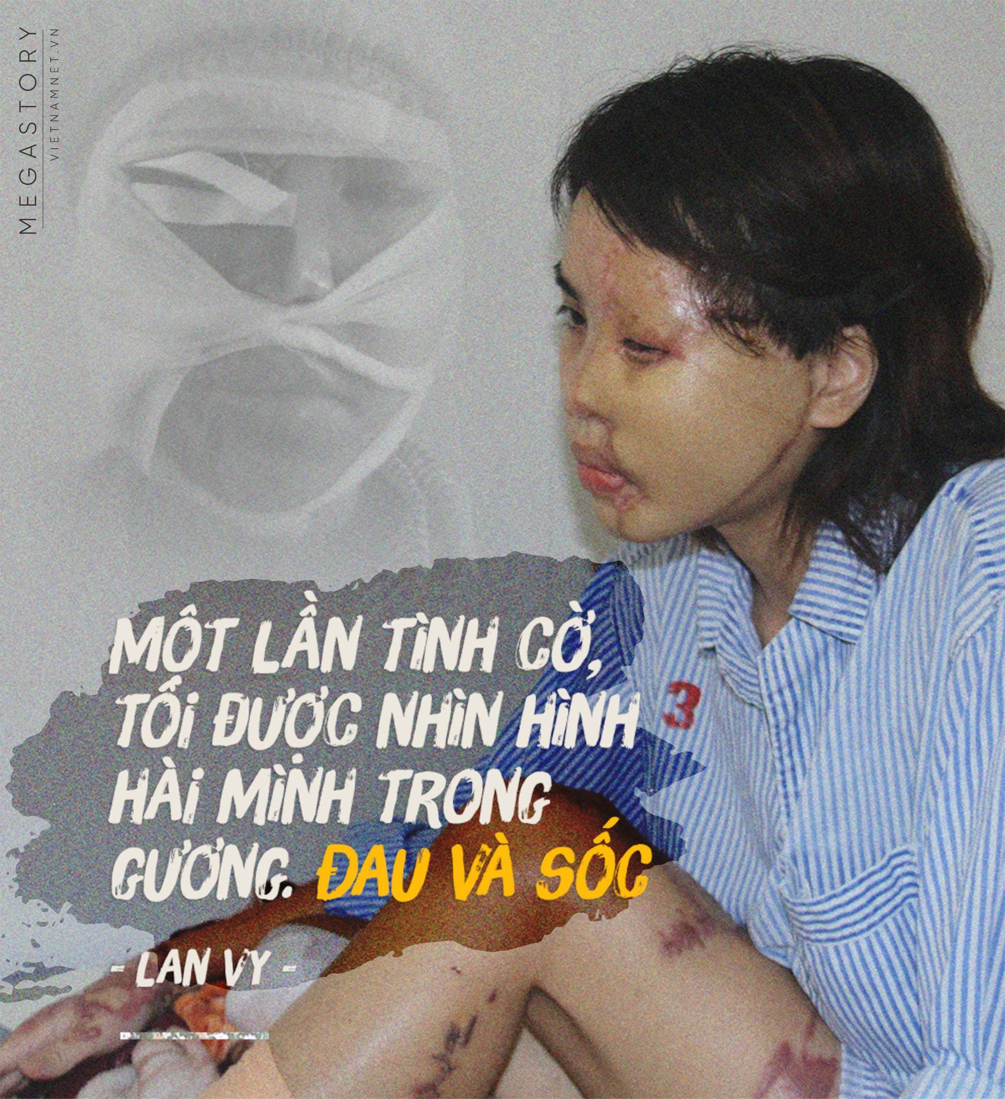 Tháng đầu tiên, bố mẹ Vy cách ly tất cả các vật dụng để chị không thể thấy gương mặt mình. ‘Điện thoại, thậm chí tủ nhôm có thể phản chiếu mặt… ông bà cũng phải di chuyển. Một lần sang khoa khác, trong phòng vệ sinh có gương, tôi mới nhìn được hình hài của mình. Đau và sốc’, Vy nói.