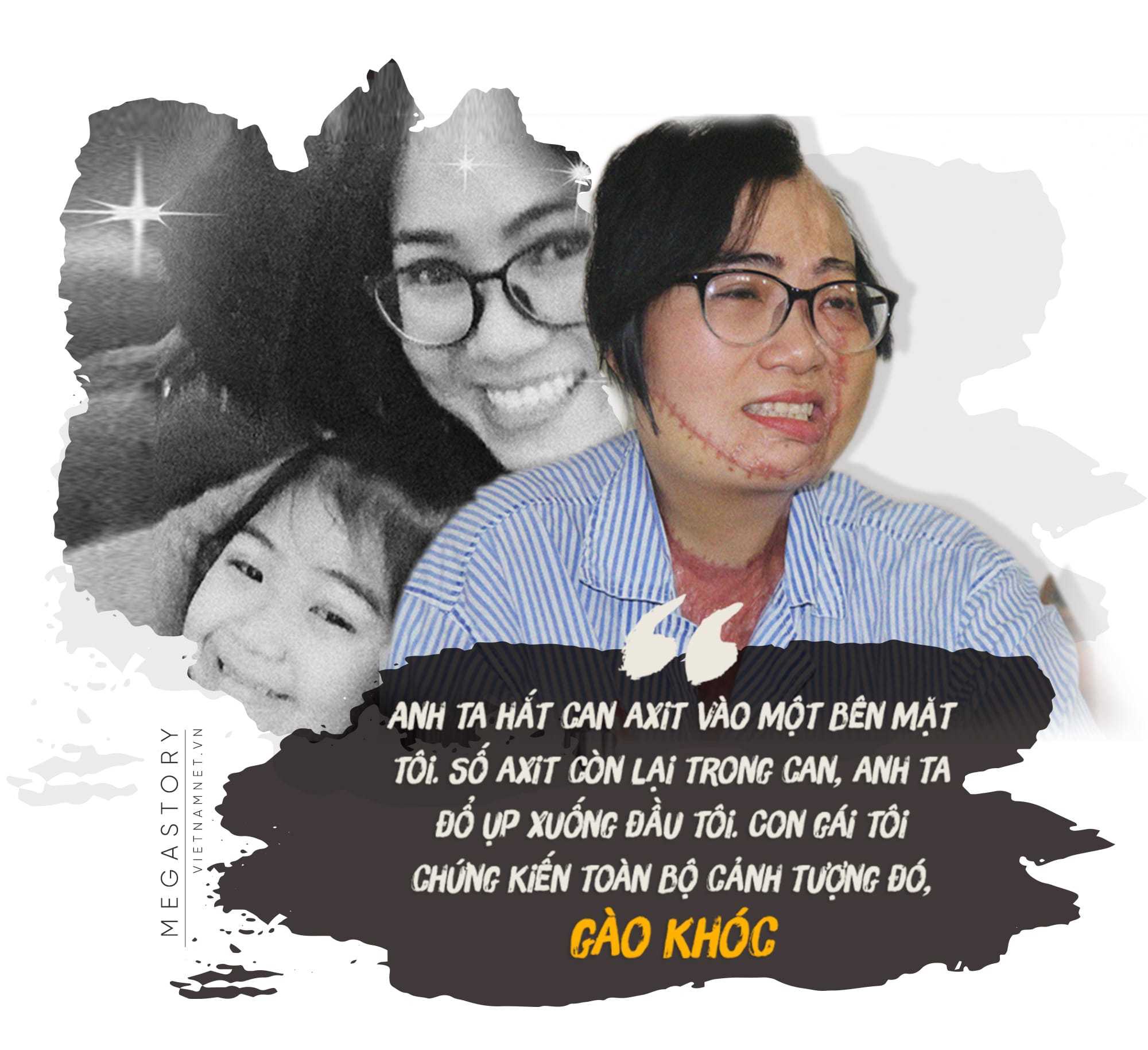 Còn một ít trong chai, người đàn ông từng thề non hẹn biển sẽ che chở cho chị suốt đời, lạnh lùng hất hết vào người chị. Trong tiếng thét của con gái, vợ chồng ông Vũ cũng bị dính axit, như chết lặng.