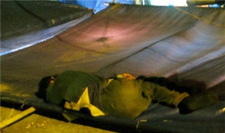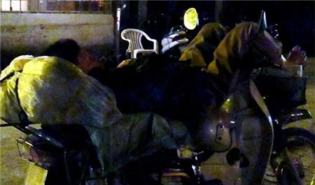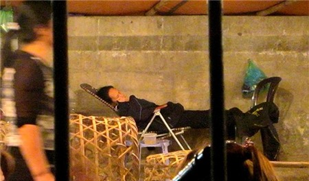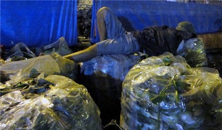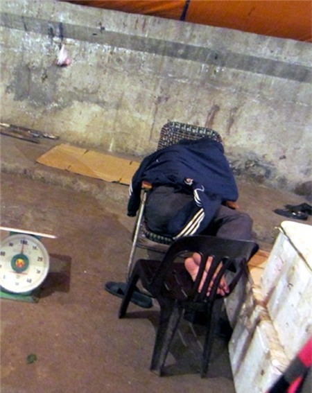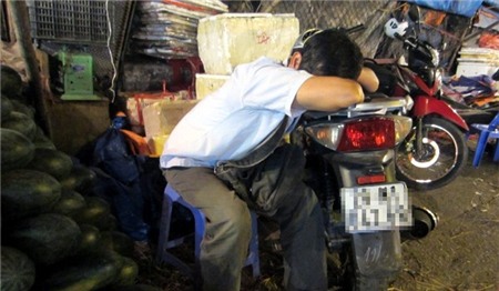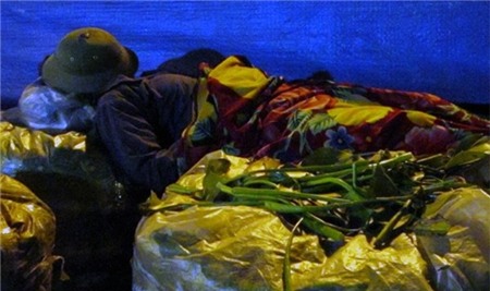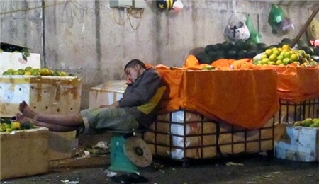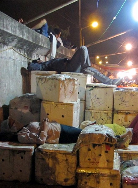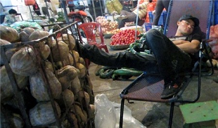 Giữa tiếng ing ỏi quát tháo, gọi nhau, mặc cả, chuyện trò... nhiều người vẫn điềm nhiên “gật gù”, mơ ngủ. Họ tranh thủ chợp mắt trong mọi tư thế: gục trên bọc hàng, thu lu trên chiếc cân đĩa, hoặc nằm ngay trên chiếc xe máy của mình.