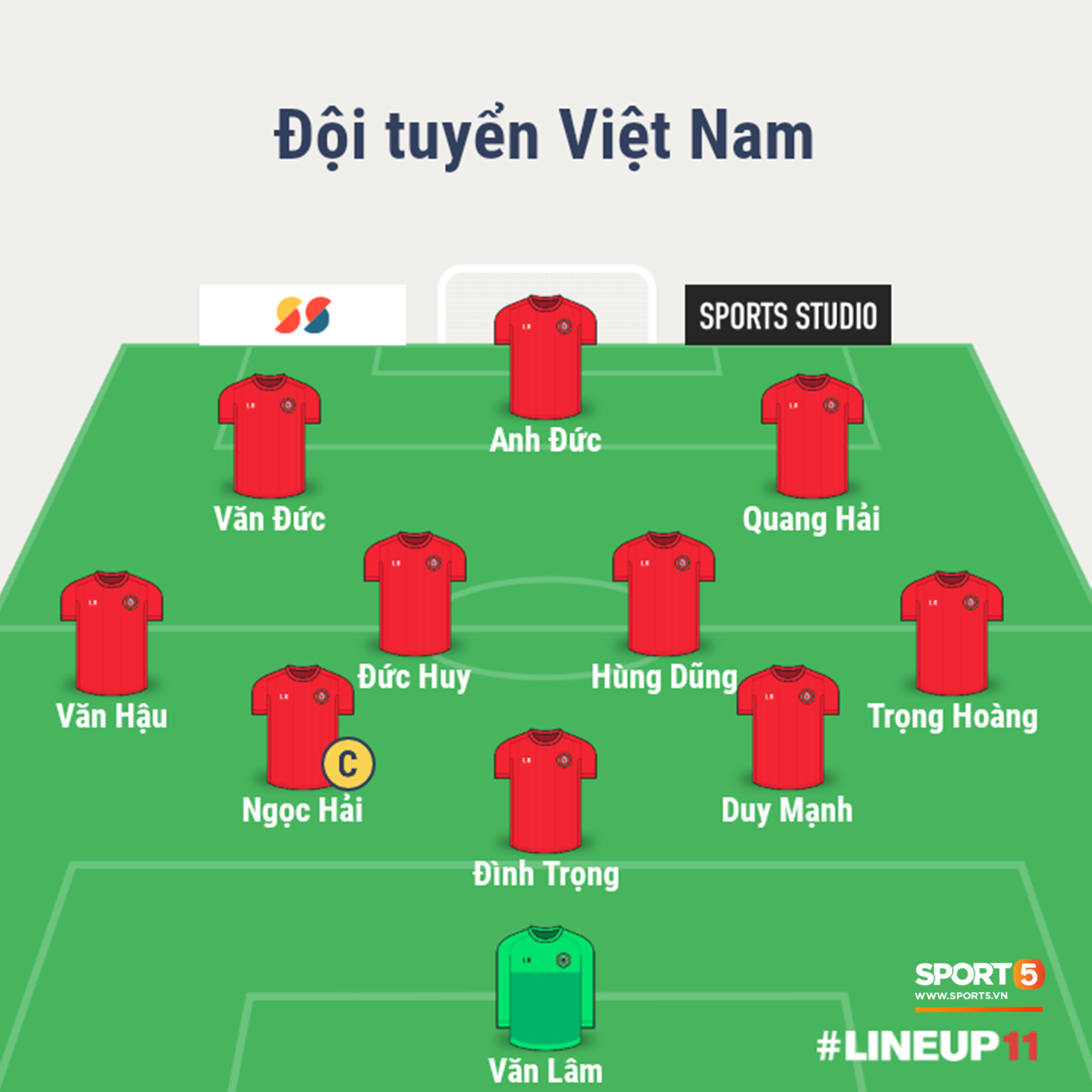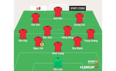 HLV Park Hang-seo thực hiện một số thay đổi đáng chú ý ở đội hình xuất phát. Bộ đôi tiền vệ thuộc biên chế CLB Hà Nội, Đức Huy và Hùng Dũng sẽ sát cánh nơi trung tâm hàng tiền vệ. Trong khi ở vị trí hộ công cho Anh Đức, Quang Hải và Văn Đức góp mặt.