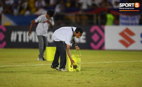 Trước giờ bóng lăn chưa đầy 30 phút, các nhân viên vẫn nỗ lực tu sửa lại mặt sân. Ảnh: Hiếu Lương.