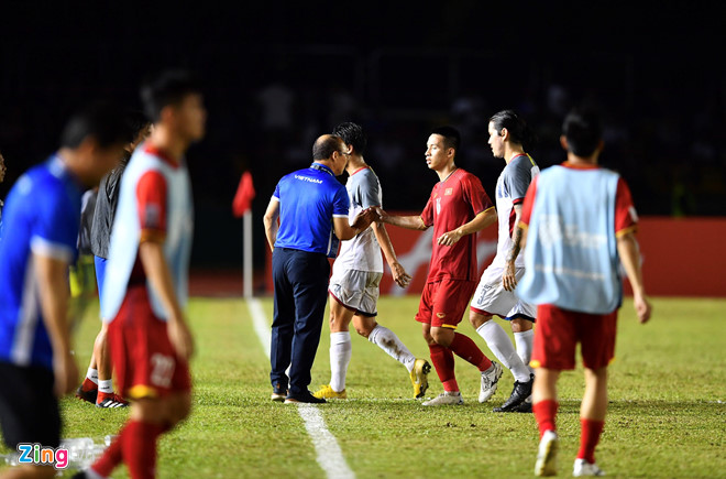 Tuyển Việt Nam điều chỉnh đội hình khi Hà Đức Chinh vào sân thế chỗ của Anh Đức. Đây là sự thay đổi cầu thủ đầu tiên của HLV Park Hang-seo.