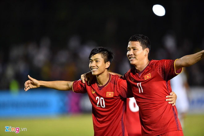 Lão tướng Anh Đức có bàn thắng thứ 3 cho đội tuyển Việt Nam tại AFF Cup 2018. Anh cùng đồng đội ăn mừng bàn thắng vào lưới Philippines. Ảnh: Thuận Thắng.