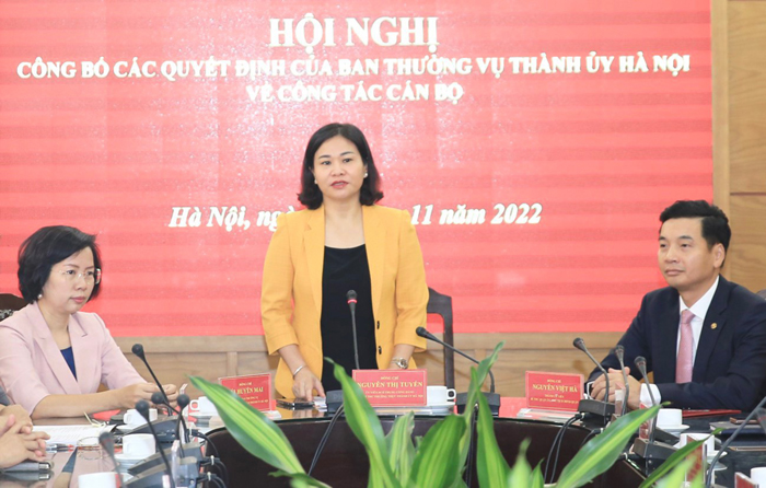 Trao các Quyết định và tặng hoa chúc mừng đồng chí Bùi Huyền Mai, Đỗ Anh Tuấn, Nguyễn Việt Hà và Lê Anh Quân, Phó Bí thư Thường trực Thành ủy Nguyễn Thị Tuyến đánh giá, cả 4 đồng chí đều là những cán bộ trong quy hoạch chức danh lãnh đạo, quản lý cao hơn; được đào tạo bài bản, kinh qua nhiều vị trí công tác, trên mỗi vị trí đều thể hiện được trình độ, năng lực của bản thân; phát huy được vai trò, trách nhiệm, nhất là trách nhiệm người đứng đầu, có nhiều cố gắng trong công tác, những năm qua đã hoàn thành tốt và hoàn thành xuất sắc nhiệm vụ được giao.