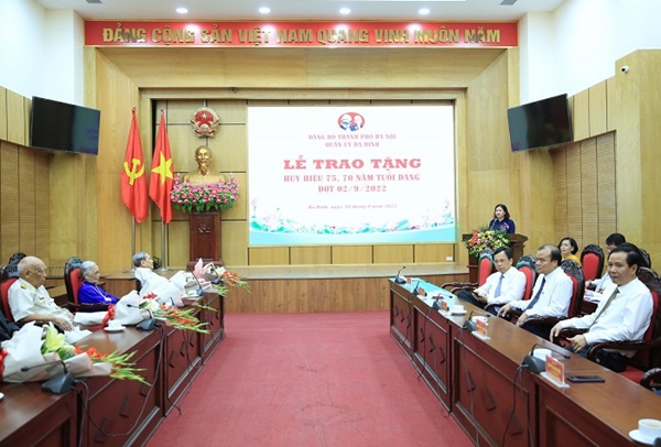 Phó Bí thư Thường trực Thành ủy cho biết, trong dịp này, toàn Đảng bộ thành phố Hà Nội có 9.892 đảng viên được vinh dự đón nhận Huy hiệu của Đảng, 244 đảng viên nhận huy hiệu từ 70 năm tuổi đảng trở lên, trong đó, Đảng bộ Quận Ba Đình có 567 đảng viên được vinh dự đón nhận Huy hiệu của Đảng, 01 đồng chí nhận huy hiệu 80 năm tuổi đảng và 29 đồng chí nhận huy hiệu 75, 70 năm tuổi đảng.