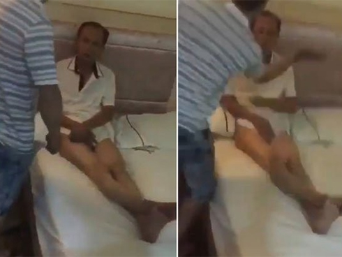 Trong đoạn clip được gia đình cô Lin ghi lại có thể thấy một người đàn ông trung tuổi không mặc quần đang ngồi khúm núm trên giường. Trong khi đó, một người đàn ông khác mặc áo kẻ đang đánh phó hiệu trưởng, được cho là người nhà của nạn nhân.