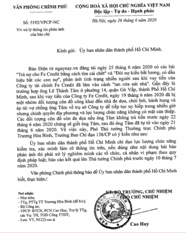 Mới đây, Văn phòng Chính phủ đã có văn bản gửi Uỷ ban nhân dân TP.HCM để nghị xác minh và xử lý nghiêm vụ việc có liên quan đến hoạt động cho vay của Công ty tài chính Fe Credit.