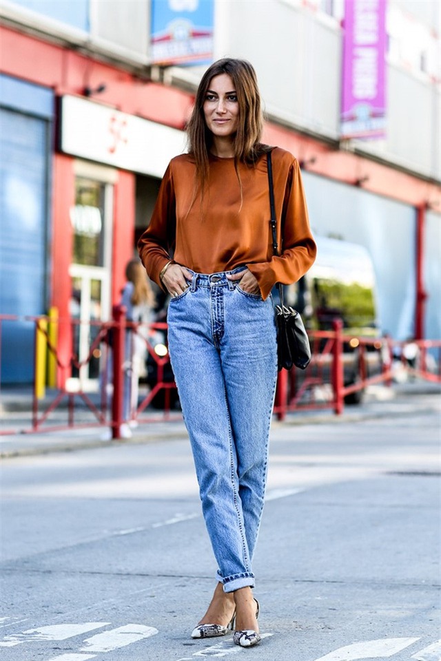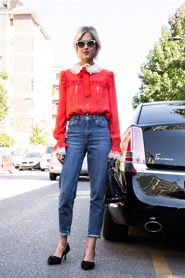 Một biến thể nữ tính khác của quần jeans cạp cao khi kết hợp áo sơ mi đăng-ten cầu kỳ.