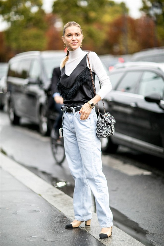 Cách layer lạ mắt khi diện áo hai dây tua rua bên ngoài áo len cao cổ cùng jeans boyfriend cá tính.