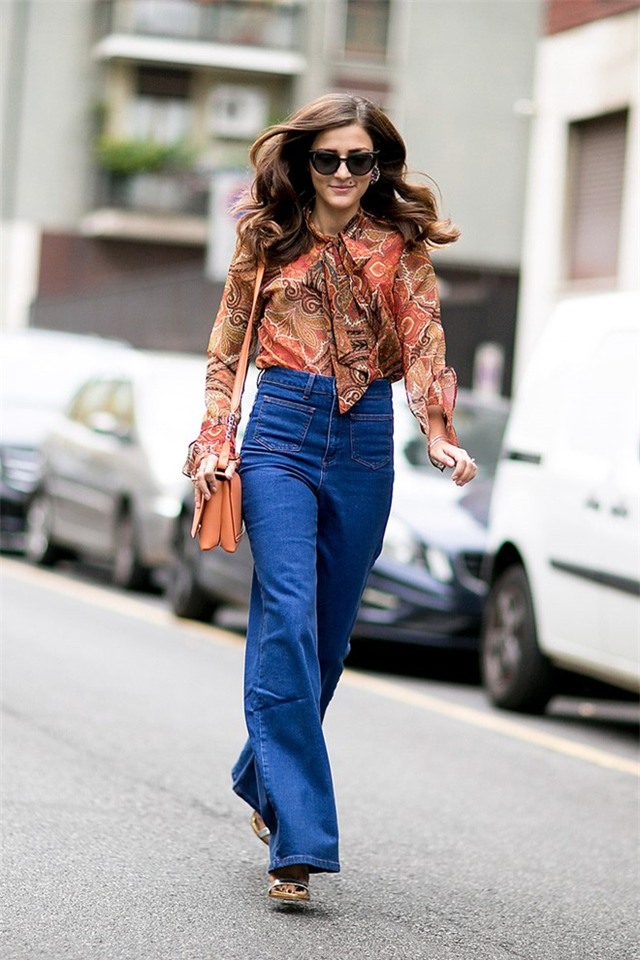 Hình ảnh cô nàng thập niên 1970 với áo sơ mi họa tiết nền nã.
