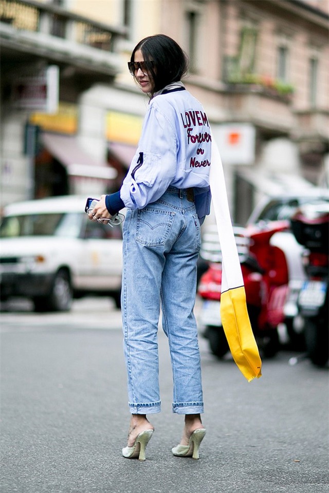 Quần jeans cạp cao trở nên chất hơn khi mix cùng áo khoác bomber in tuyên ngôn cá tính.