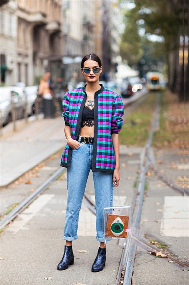 Tín đồ thời trang này mix quần jeans cạp cao cùng bra top và áo khoác caro sắc màu. Với set đồ này, bạn nên chọn bốt hoặc sneakers để hoàn thiện phong cách.