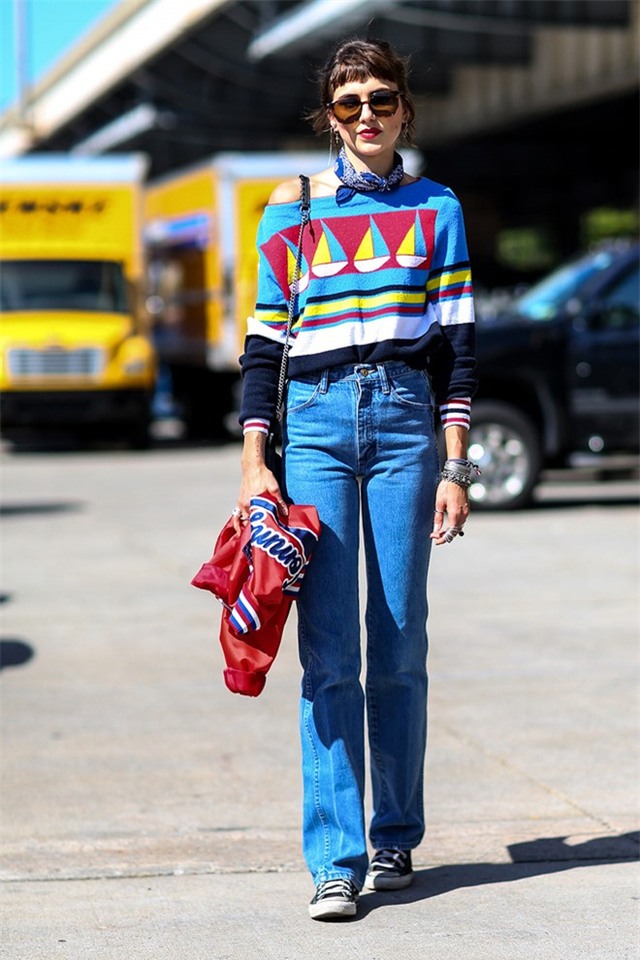 Nếu bạn yêu thích phong cách vintage, có thể thử phối quần jeans cạp cao cùng sweater kéo lệch vai. Điểm nhấn của trang phục nằm ở phần khăn thắt duyên dáng cổ điển.