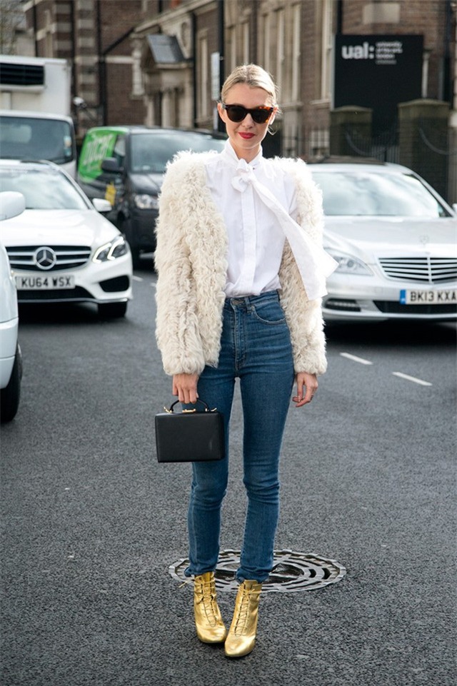 Một tổng hòa hoàn hảo từ các item trendy nhất: sơ mi trắng, áo khoác lông, bốt ánh kim và túi xách mini.