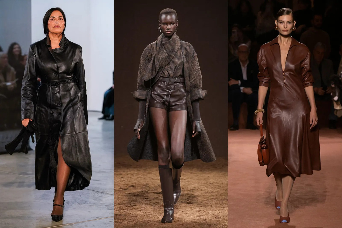 Áo khoác bomber da làm tăng vẻ sang trọng cho phong cách thể thao, xuất hiện tại sàn diễn Lemaire và Eckhaus Latta. Riêng Fendi và Hermès thì gây ấn tượng mạnh khi sử dụng chất liệu da cho quần short và váy sơ mi.