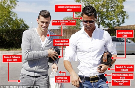 Ngược lại, Ronaldo “chơi” toàn “hàng hiệu” với tổng giá trị lên đến 12,192 bảng. Cụ thể: Kính mát Chrome Heart giá 552 bảng; Túi cầm tay Gucci giá 256 bảng; Thắt lưng Dolce & Gabbana giá 450 bảng; Đồng hồ Jacob giá 10,600 bảng; Quần jeans Dsquared giá 325 bảng; Áo (không rõ thương hiệu và giá)Vẫn biết Bale vốn là một chàng trai khiêm tốn và không thích sự hào nhoáng. Nhưng có lẽ anh sẽ sớm phải học hỏi đàn anh CR7 trong cách ăn mặc. Cần biết rằng, Real Madrid không muốn chi ra 86 triệu bảng chỉ để mang về một siêu cầu thủ thầm lặng. Điều Los Blancos cần nữa là một siêu sao biết trưng diện, đánh bóng bản thân để giúp CLB chủ quản bán áo, bán vé cũng như kiếm hợp đồng quảng cáo!