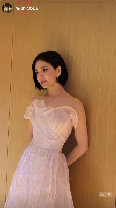 Trong khi đó, Song Hye Kyo cũng xuất hiện dịu dàng với đầm cúp ngực tông màu be. Nữ diễn viên khoe trọn nhan sắc "nữ thần" trong veo cùng lớp trang điểm "có như không".