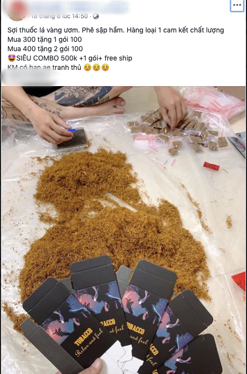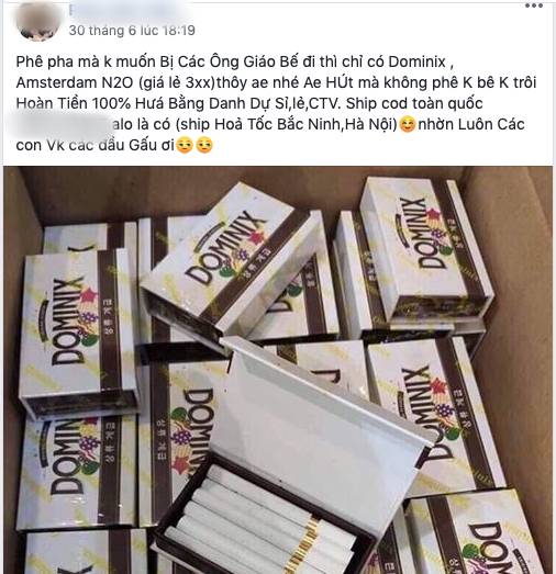 Chỉ cần lên mạng xã hội Facebook gõ những cụm từ khoá tìm kiếm mỹ miều như "thuốc lá tobacco", "thuốc lá dominix", "thuốc lá vui" hoặc "thuốc lá cười", hàng loạt các trang page, nhóm đăng bài quảng cáo, rao bán các loại thuốc lá này sẽ hiện lên cùng những lời quảng cáo "có cánh".