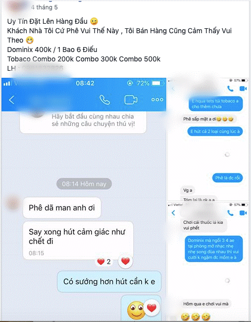 "Hút 3 hơi phiêu tới sáng mai hẹn gặp lại", "Phê nhấc người, phê nhấc thủ cấp, vui hơn khi có nhạc", "Chơi mà không lên thì chơi làm gì, bao phê như đổ lúa" hay "3 hơi lên 9 tầng mây, không phê hoàn tiền 100%"… là những lời quảng cáo của những người bán các loại thuốc này trên mạng.