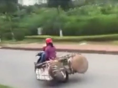 Chở theo hai sọt lớn, chiếc xe đã không còn đủ chỗ cho 2 người phụ nữ này có thể ngồi một cách an toàn. Nhưng họ vẫn điềm nhiên "phóng như bay" trên đường.