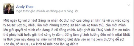 Do những rắc rối trong việc quản lý công ty Music Box với ca sĩ Thanh Thảo trước đây, nên theo lời "búp bê" Thanh Thảo cho biết Thúy Vinh khá xem thường pháp luật khi tòa án, Sở KHĐT, Công an Kinh tế mời nhiều lần vẫn không đến. Thậm chí ca sĩ Thanh Thảo còn "khuyên" Thúy Vinh hoặc là tuân thủ pháp luật, hoặc là giải thể công ty để tránh gây rắc rối cho cô.