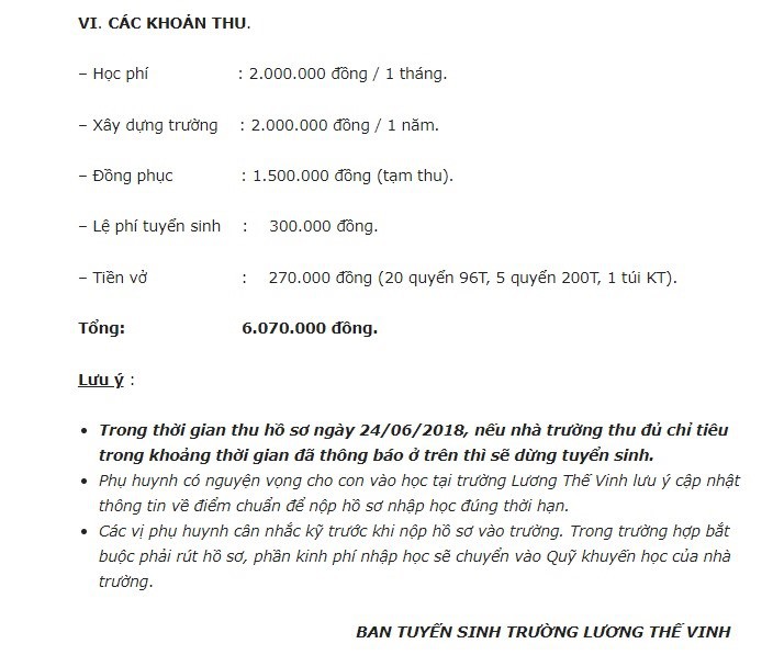 Trang web của trường THCS và THPT Lương Thế Vinh nêu rõ nếu bắt buộc rút hồ sơ, phần kinh phí nhập học sẽ chuyển vào Quỹ khuyến học của nhà trường