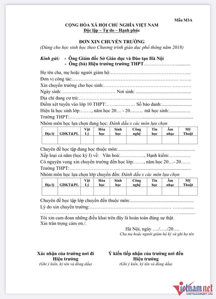 Mẫu đơn xin chuyển trường tại Hà Nội
