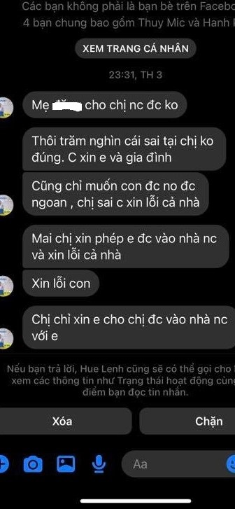 Theo chị D., vào hơn 23h khuya 10/11, cô giáo có nhắn tin xin lỗi, nhận sai và xin phép được đến nhà nói chuyện nhưng chị không trả lời. Cô giáo cho rằng thường ngày cô rất thương cháu, chăm sóc cháu chu đáo, cháu ngủ cũng phải gối tay cô nằm mới ngủ được. Lý do cô giáo đưa ra là đánh vì cháu không chịu ăn, "muốn cháu no và ngoan". "Trăm ngàn cái sai cũng tại chị không đúng. Chị xin em và gia đình", cô giáo nói.