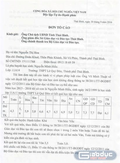 Theo đơn trình bày của bà Hoa “Năm học 2015-2016, con tôi (Nguyễn Minh Hiếu_PV) có kết quả học tập như sau:
