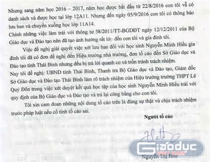 Đối chiều với nghị định, thông tư trên thì con tôi vẫn đạt, đủ điều kiện lên lớp. Tuy nhiên khi đang có trong danh sách lên lớp 12A11 thì bất ngờ nhận được thông báo lưu ban xuống lớp 11A4 khiến gia đình rất bức xúc”.