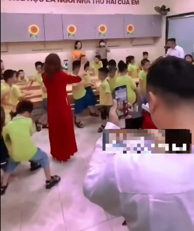 Các học sinh mặc đồng màu xanh tỏ ra rất hào hứng. Nhiều học sinh tự tin nhảy theo nhạc. Một số ngại ngùng đứng ngoài nhìn các bạn nhảy. Một vài phụ huynh khác vừa khuấy động lớp học, vừa dùng điện thoại ghi lại khoảnh khắc vui vẻ của các học sinh.