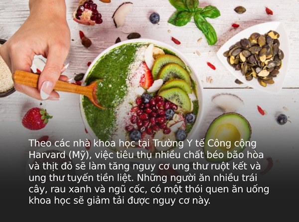 Theo các nhà khoa học tại Trường Y tế Công cộng Harvard (Mỹ), việc tiêu thụ nhiều chất béo bão hòa và thịt đỏ sẽ làm tăng nguy cơ ung thư ruột kết và ung thư tuyến tiền liệt. Những người ăn nhiều trái cây, rau xanh và ngũ cốc, có một thói quen ăn uống khoa học sẽ giảm tải được nguy cơ này.