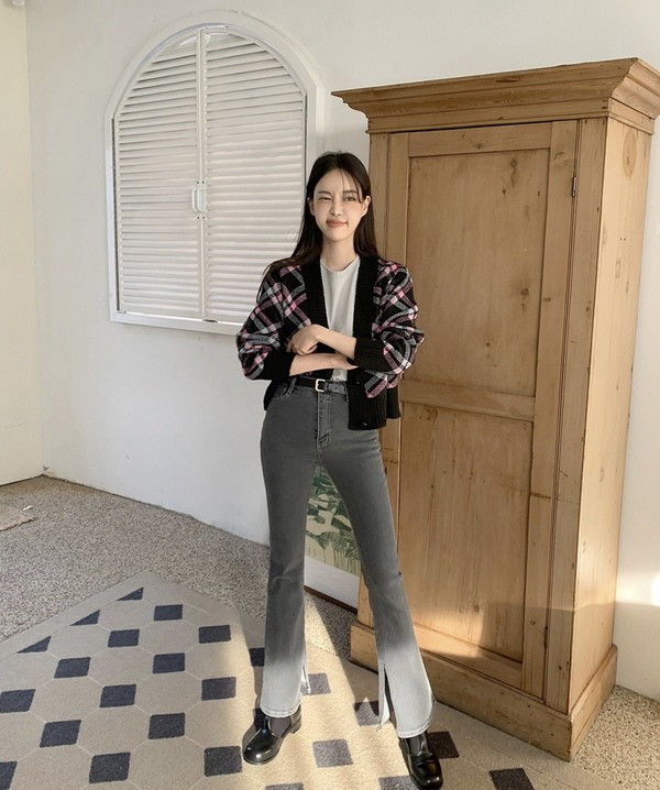 Công thức áo thun + quần jeans ống loe + áo cardigan đơn giản nhưng không hề nhàm chán.