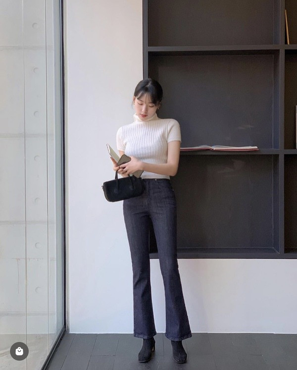Chiếc áo len cao cổ cộc tay siêu hợp với thời tiết se lạnh, phối cùng quần jeans ống loe tạo nên bộ trang phục hoàn hảo.