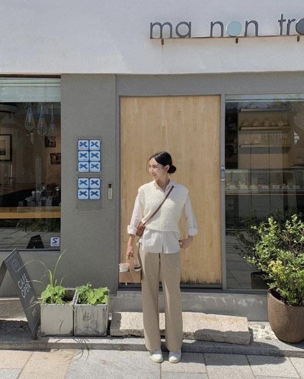 Quần ống suông màu be kết hợp cùng áo sơ mi và áo len ghi - lê là công thức hoàn hảo cho nàng diện Tết.
