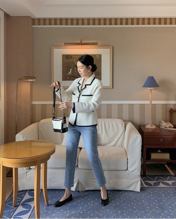 Vào những ngày đầu xuân, nàng có thể diện quần jeans ống đứng với nhiều kiểu áo khác nhau. Cô nàng này đã kết hợp khéo léo giữa áo cao cổ và áo khoác vải tweed, bên dưới là quần jeans ống đứng và boots mũi vuông lịch sự mà vẫn đảm bảo sang chảnh không ai bằng.