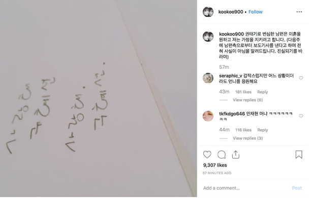 Bức ảnh có dòng chữ "Anh yêu em, Goo Hye Sun" cùng dòng trạng thái: "Chồng tôi đã thay đổi và muốn ly hôn trong khi tôi vẫn muốn níu giữ. Tuần tới, phía đại diện của chồng tôi sẽ đưa ra thông báo chính thức và tôi muốn nói tất cả đều không phải là sự thật. Tôi hy vọng sự thật sẽ được đưa ra ánh sáng".