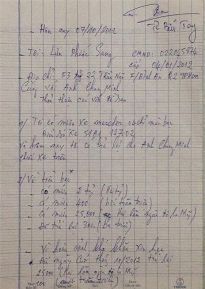 "Tôi lấy xe về với biên bản cam kết trả nợ trong 2 tháng sau đó (chốt vào tháng 12.20012). Biên bản có 7 chữ ký người làm chứng, đều là bạn thân của Phước Sang trong đó có cựu diễn viên Lê Tuấn Anh", Chung Minh cho biết.