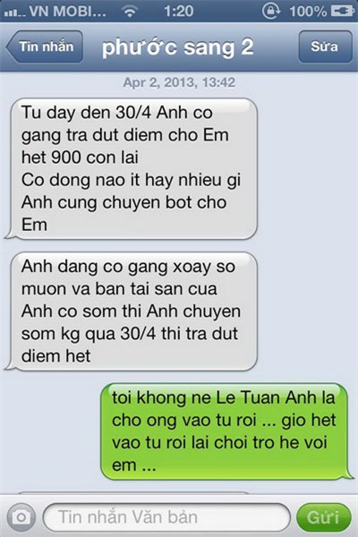 Nội dung tin nhắn "ông bầu" Phước Sang hứa sẽ trả hết nợ trước ngày 30.4 gửi