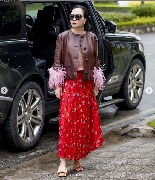 Đang có dịp ra Hà Nội tận hưởng chút không khí lạnh cuối mùa, nữ doanh nhân 7X quyết định "cưa sừng làm nghé" với combo thời trang áo da, chân váy hoa đỏ kèm áo ren phối lụa bên trong.