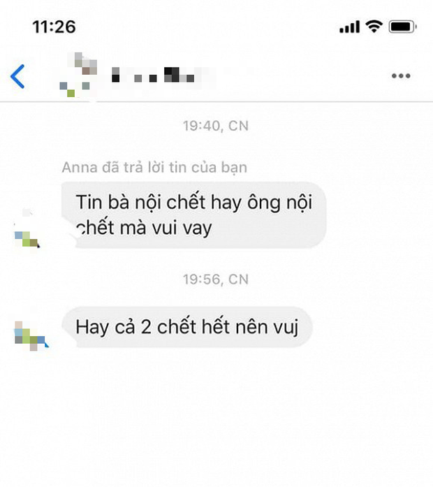 Ông bà nội con đã mất rồi. Họ là người đã sinh ra ba con, nên con luôn có sự tôn kính đối với ông bà. Và con không muốn ai xúc phạm đến gia đình mình. Con nghĩ ai cũng vậy thôi, không muốn gia đình mình bị người khác nguyền rủa mà không vì bất kì điều gì. Con tự hỏi, nếu như ông bà con còn sống, con đọc được những lời này từ cô, thì cảm xúc lúc đó của con còn tệ như thế nào?".