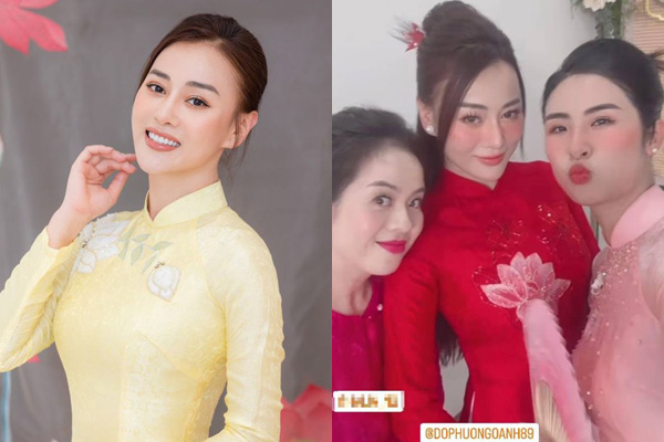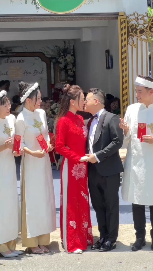 Anh tỏ ra căng thẳng, hồi hộp trước giờ đón dâu, ra hiệu cảm ơn khi được bạn bè cô dâu cổ vũ. Phương Oanh diện áo dài đỏ đính hoạ tiết hoa sen, rạng rỡ trong ngày trọng đại.