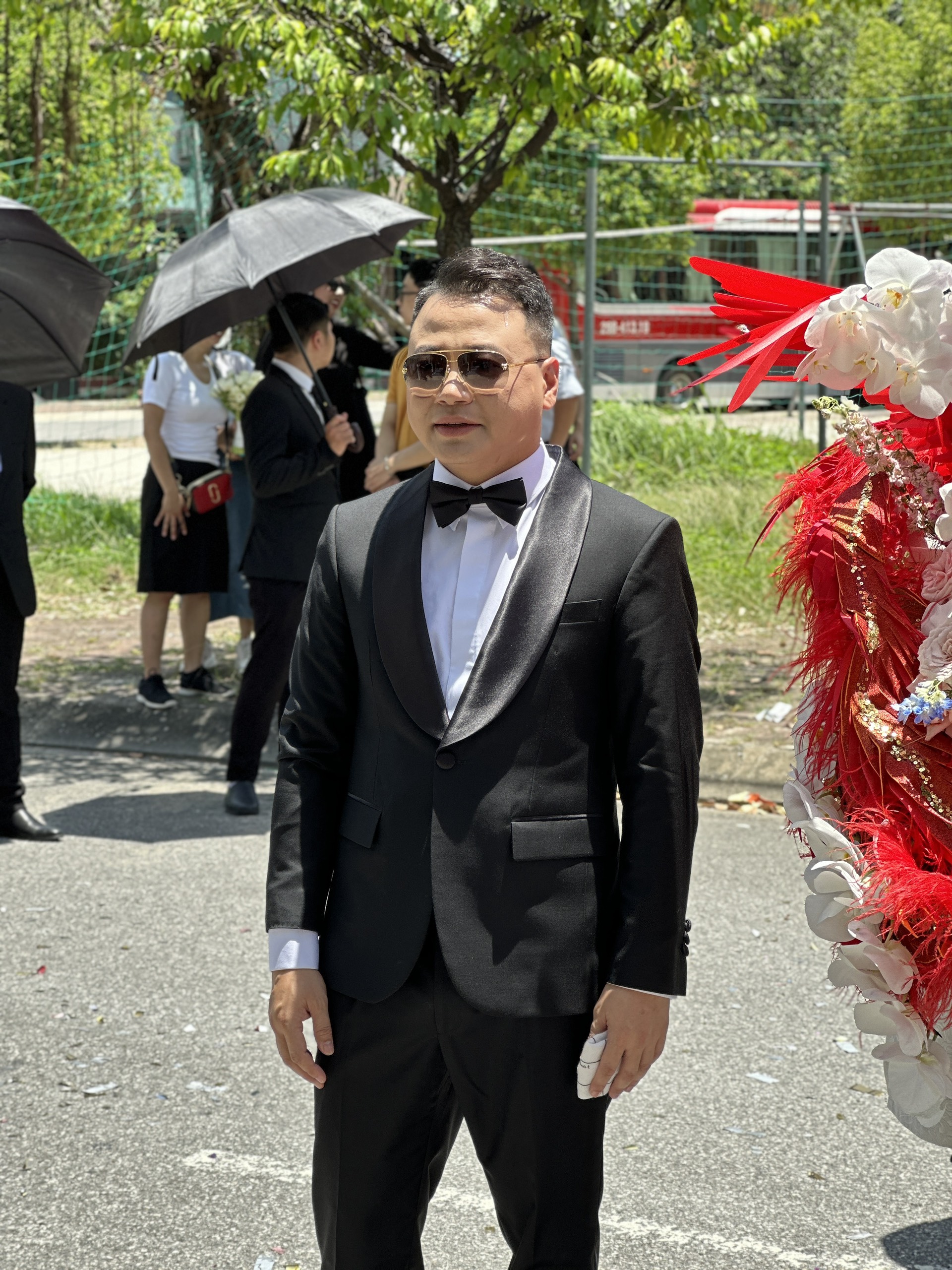 Giữa thời tiết nắng nóng khiến cả hai đổ mồ hôi, shark Bình liên tục dùng khăn giấy lau mồ hôi cho vợ. Cặp vợ chồng đan tay, hôn nhau trong tiếng vỗ tay của hai họ.