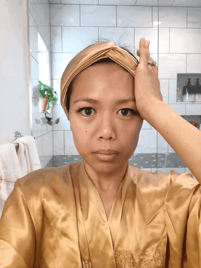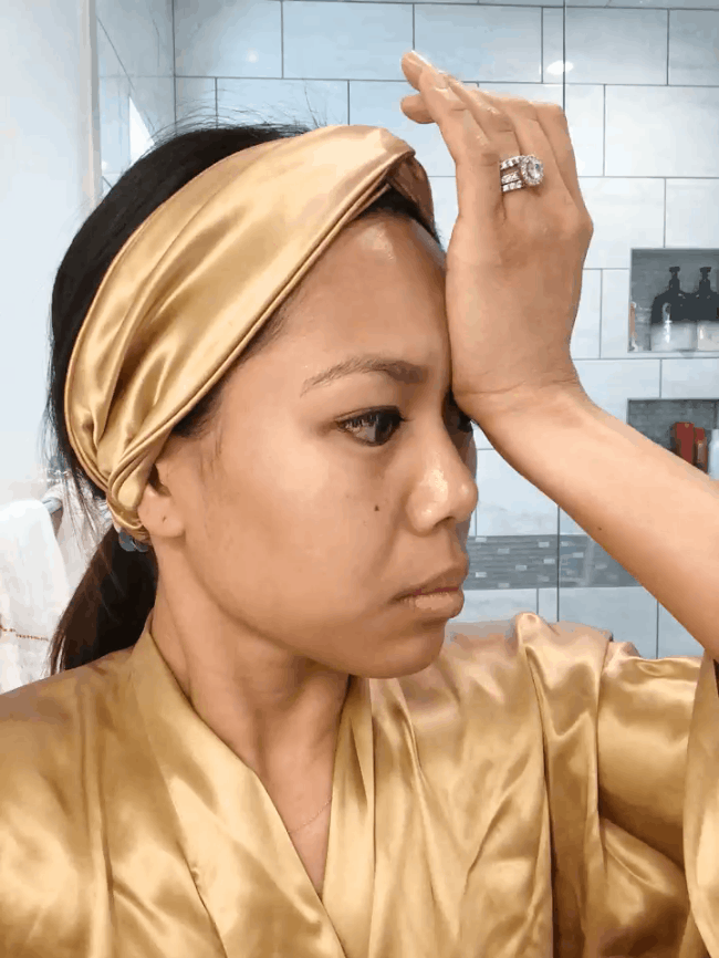 Chuyển đến 2 bên thái dương, bạn lại lặp lại động tác áp lòng bàn tay vào thái dưỡng - ấn nhẹ trong 5 giây – chuyển động tròn. Sau bước này, Sara nhận thấy đôi mắt của cô có vẻ sáng và tỉnh táo hơn, làn da cũng căng mịn, không còn chảy xệ như trước.