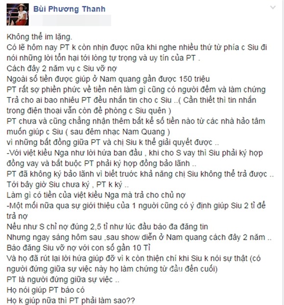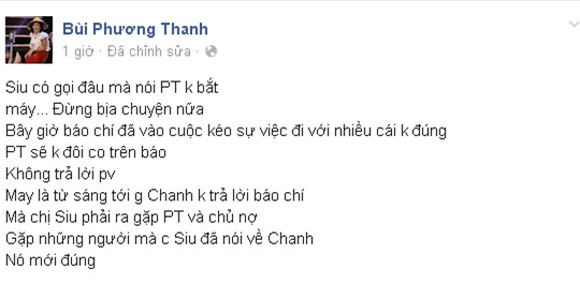 Trên trang cá nhân cách đây ít giờ, Phương Thanh tiếp tục phản pháo: "Siu có gọi đâu mà nói Phương Thanh không bắt máy... Đừng bịa chuyện nữa! Bây giờ báo chí đã vào cuộc kéo sự việc đi với nhiều cái không đúng. Phương Thanh sẽ không đôi co trên báo. Không trả lời phỏng vấn. May là từ sáng tới giờ Chanh không trả lời báo chí. Mà chị Siu phải ra gặp Phương Thanh và chủ nợ. Gặp những người mà chị Siu đã nói về Chanh. Nó mới đúng".