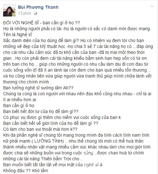 Bạn tưởng nghệ sĩ sướng lắm à? Chúng ta cùng là con người với nhau nên đau khổ cũng như nhau – chỉ là ai ít ai nhiều hơn ai. Bạn cần gì ở nghệ sĩ? Bạn cần biết hết đời tư của họ để làm gì? Có phục vụ được gì thêm cho niềm vui cuộc sống của bạn không?