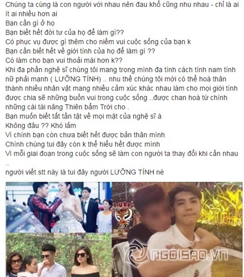 Bạn cần biết hết về giới tính của họ để làm gì? Có làm cho bạn vui thoải mái hơn không? Khi đa phần nghệ sĩ chúng tôi mang trong mình đa tính cách tính nam tính nữ phải mạnh. Như thế chúng tôi mới có thể hoá thân thành nhiều nhân vật mang nhiều cảm xúc buồn vui khác nhau làm cho mọi giới tính được chia sẻ những buồn vui trong cuộc sống… Được chan hoà từ chính những cái tài năng thiên bẩm trời cho. Bạn muốn biết tất tần tật về mọi mặt của nghệ sĩ á. Không đâu? Khó lắm.